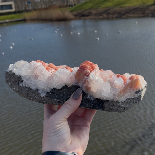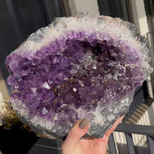 Amethist ‘cut base’ uit Uruguay XXL met rood/bruine accenten en druzy spots.
