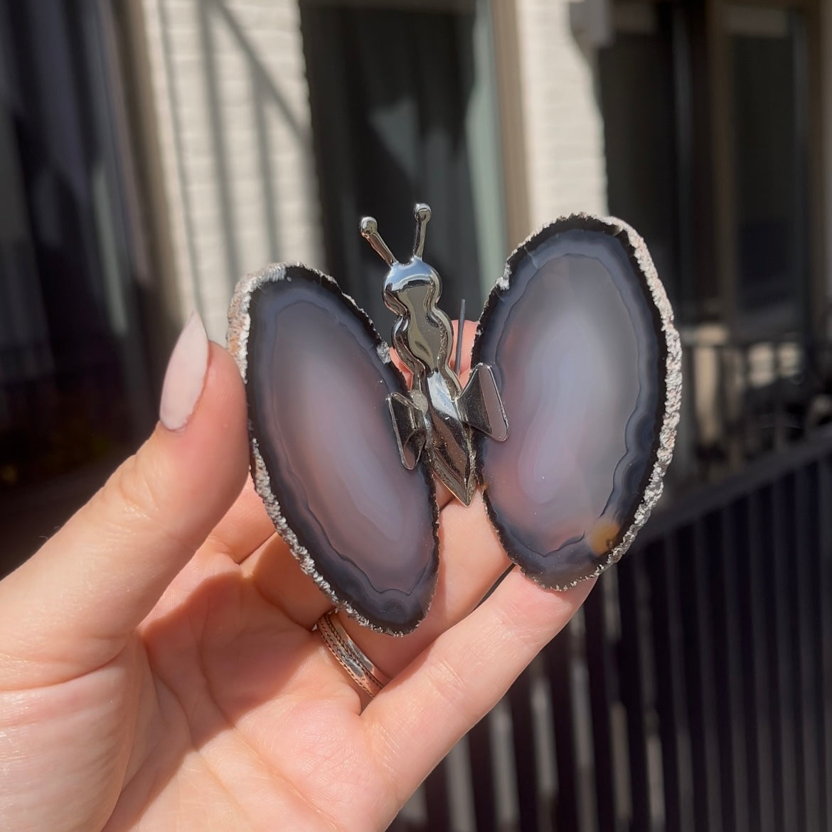 De agaat vlinder met zilverkleurige basis is ongeveer 7cm breed, 7cm hoog en weegt 35 gram.
