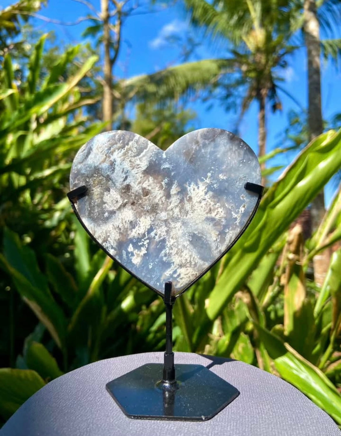 Dit blue plume agaat hart wordt geleverd inclusief standaard die perfect is gevormd naar de vorm van het hart zodat deze mooi aansluiten op elkaar.