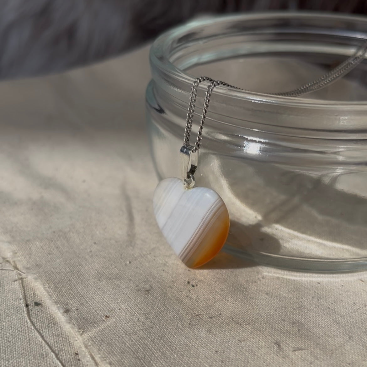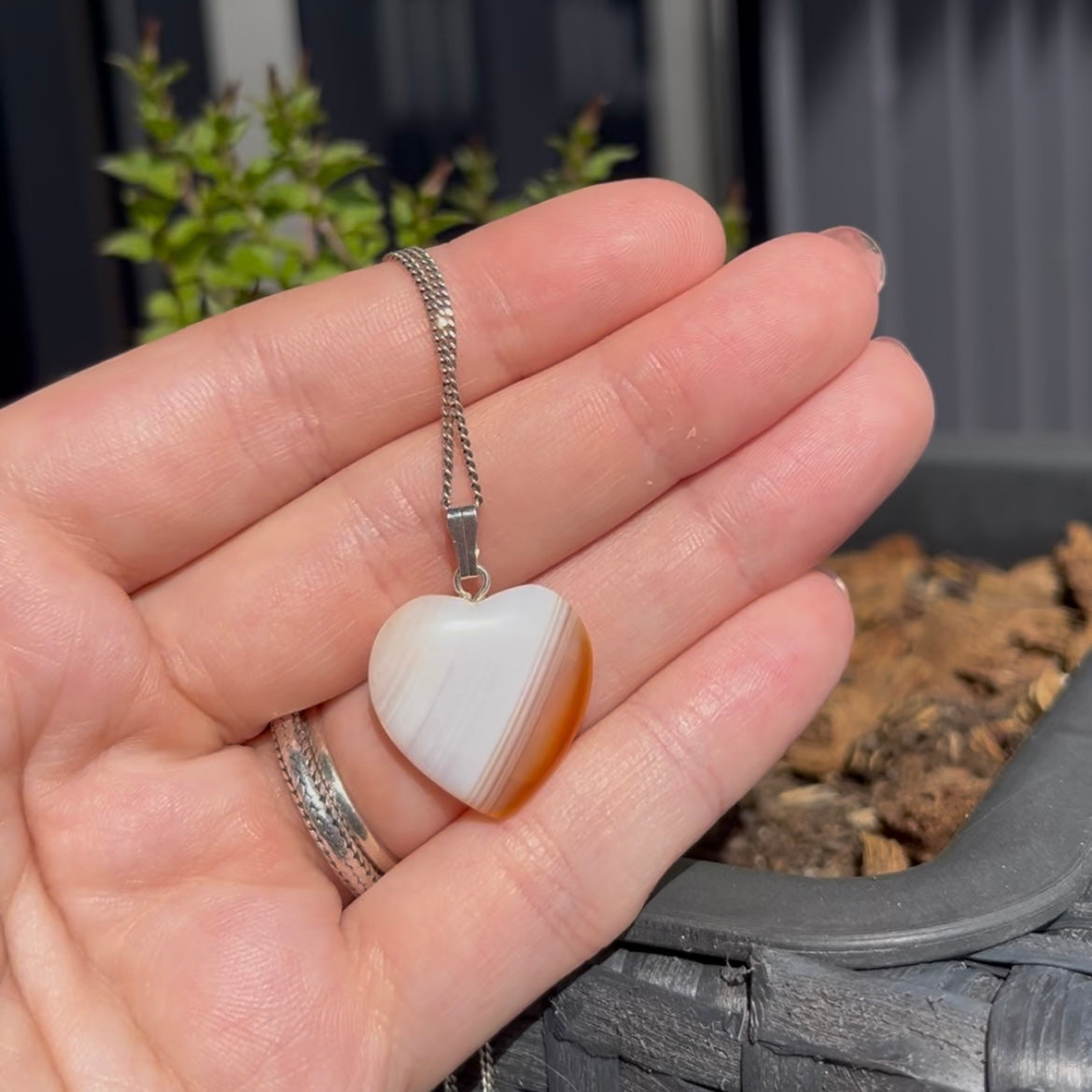 Deze hartvormige kettinghanger van gebrand carneool met zilverkleurige accenten heeft een doorsnee van 2 cm.