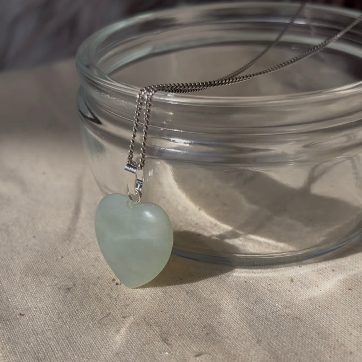 Deze hartvormige kettinghanger van new jade/serpentijn met zilverkleurige accenten heeft een doorsnee van 2 cm.