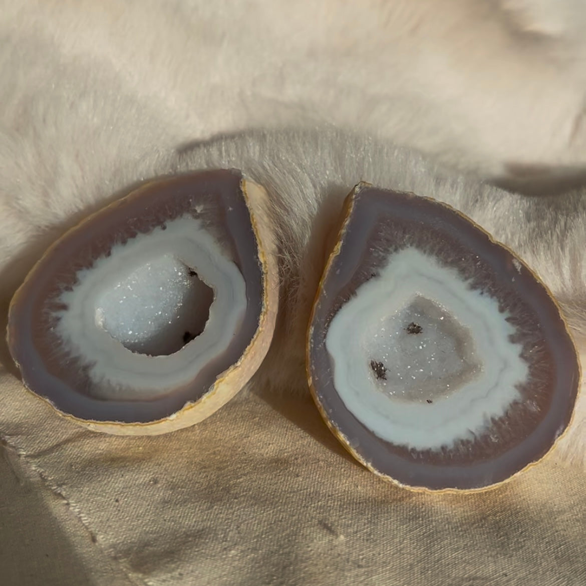 Bij elkaar horende agaat druppel set. Beide helften hebben een prachtig effect in het midden. Ruim 6cm hoog.