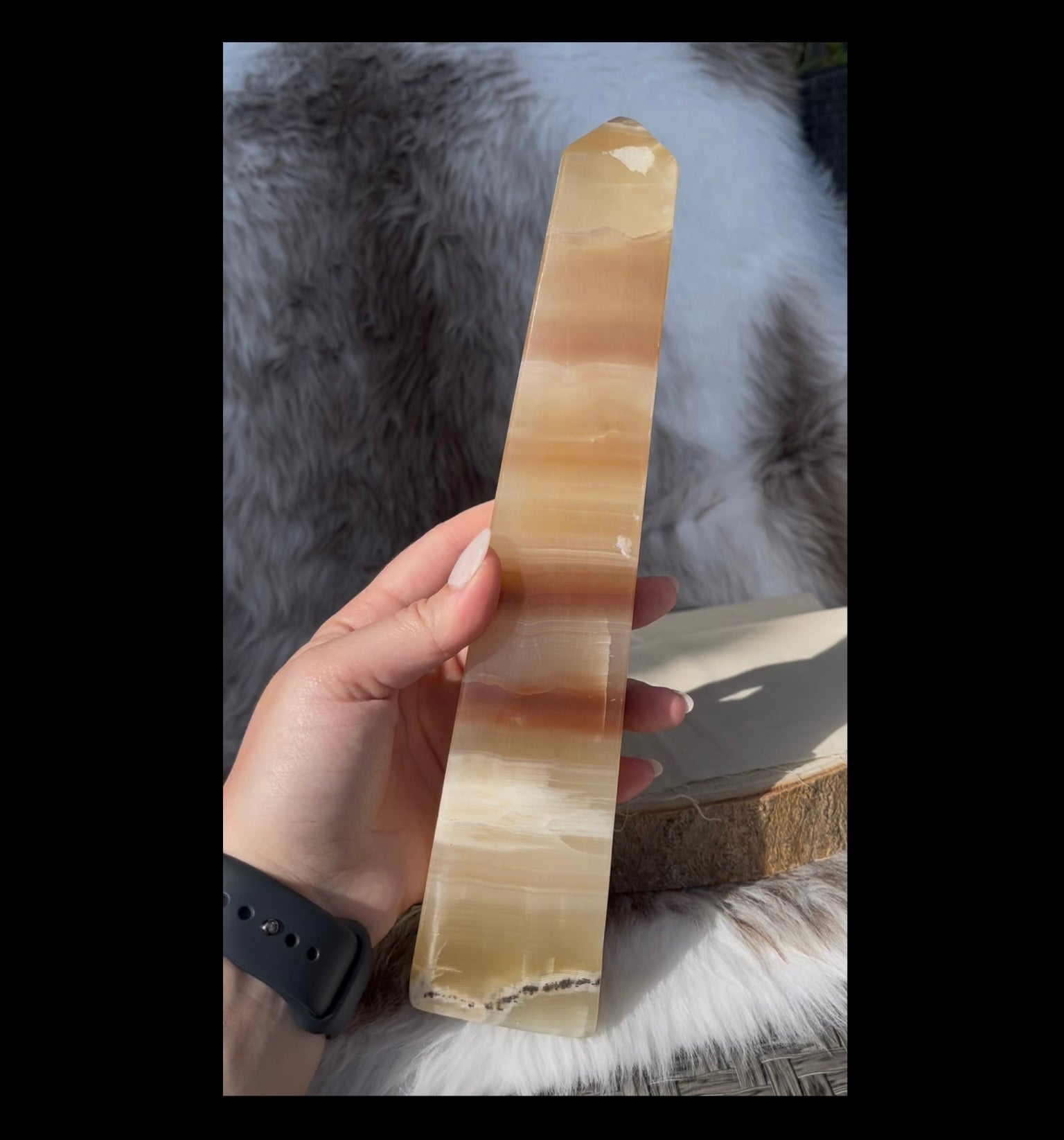 Deze XXL toren van honing calciet is 27cm hoog en weegt ruim een kilo.