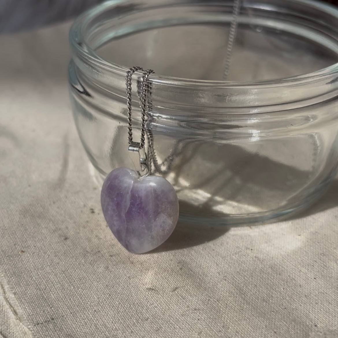Deze hartvormige kettinghanger van amethist met zilverkleurige accenten heeft een doorsnee van 2 cm.