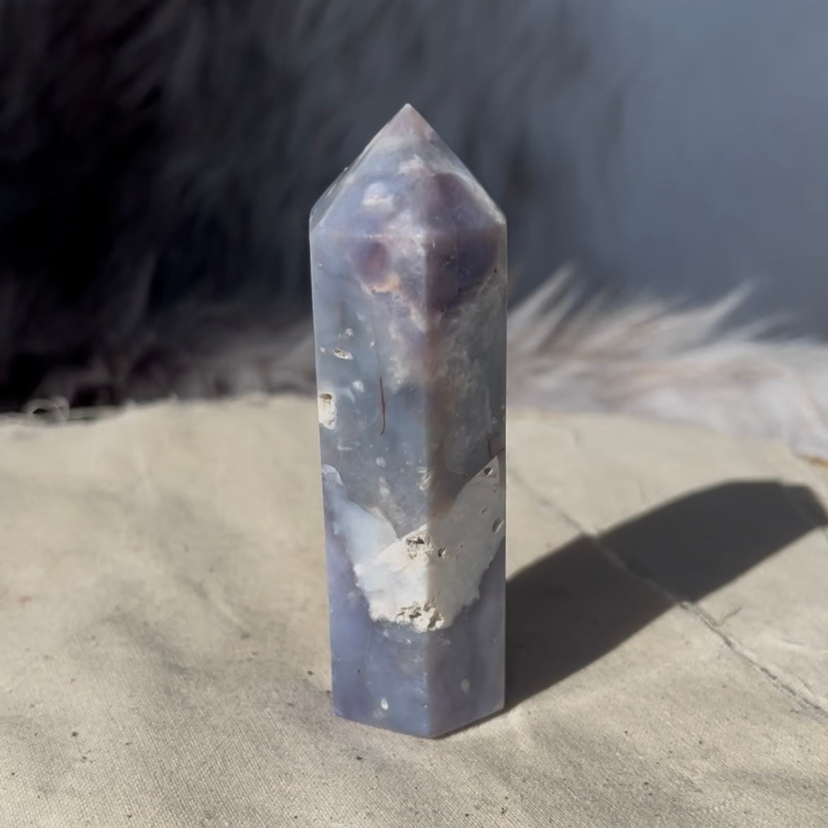 Deze paarskleurige agaat toren is 7,5cm hoog
