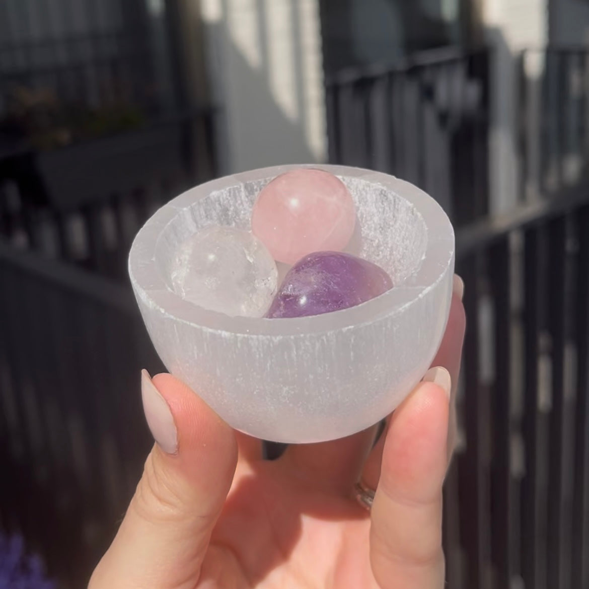 Het seleniet schaaltje heeft een diameter van 7cm en is ongeveer 3cm hoog.