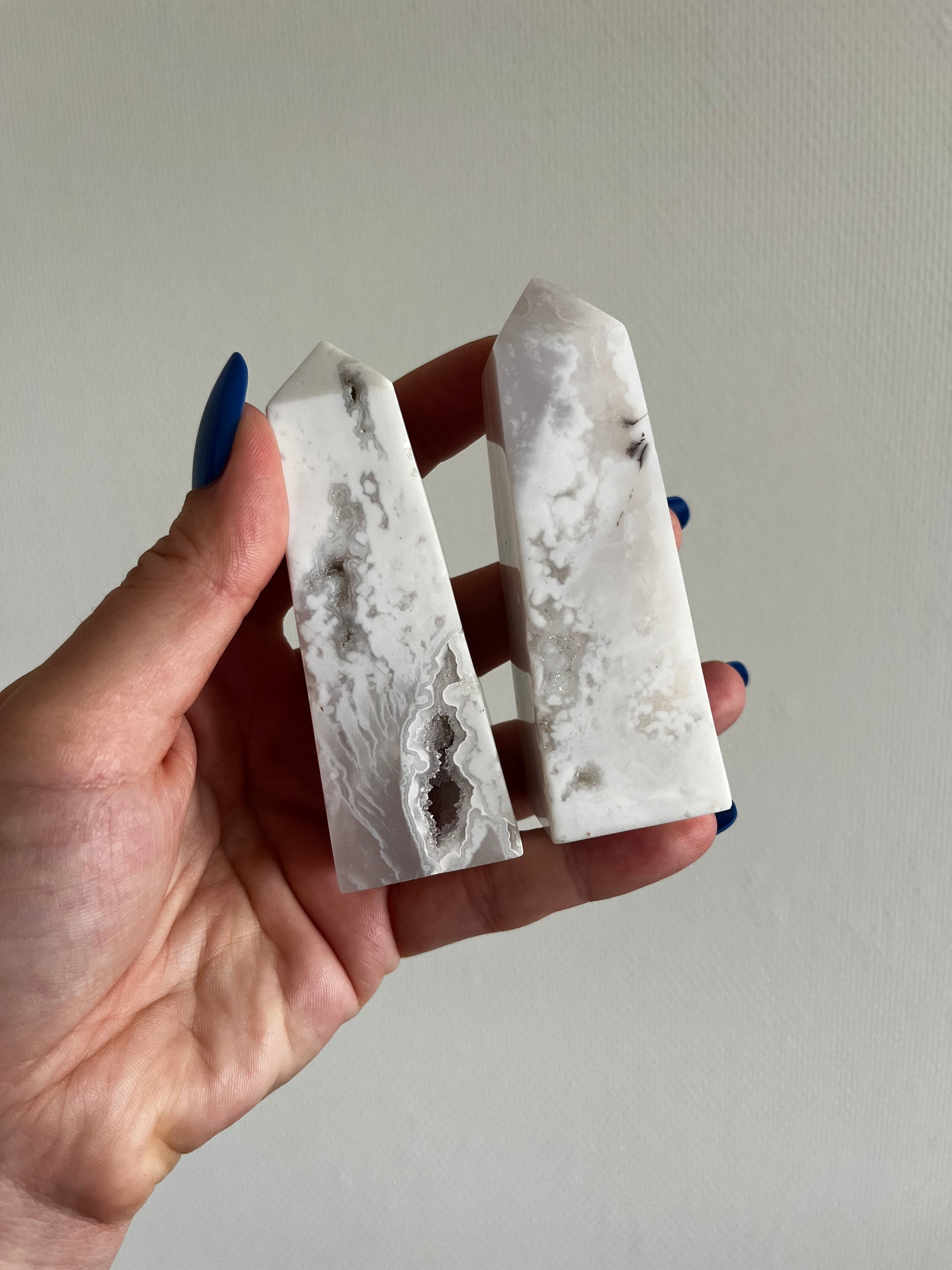 Deze White plume agaat torens zijn ongeveer 150 gram en 9 cm hoog. Tip: een mooie set om samen tentoon te stellen!